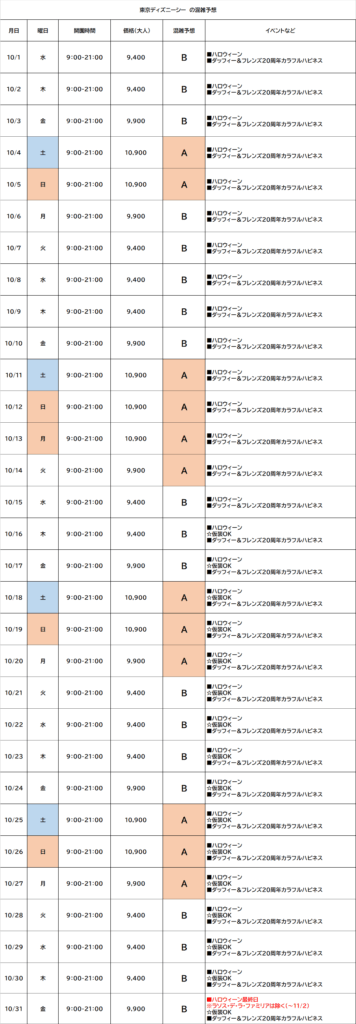 10月の基本的な考え方は、土日祝は激混み予想、月曜日が混雑を予想という考え方となります